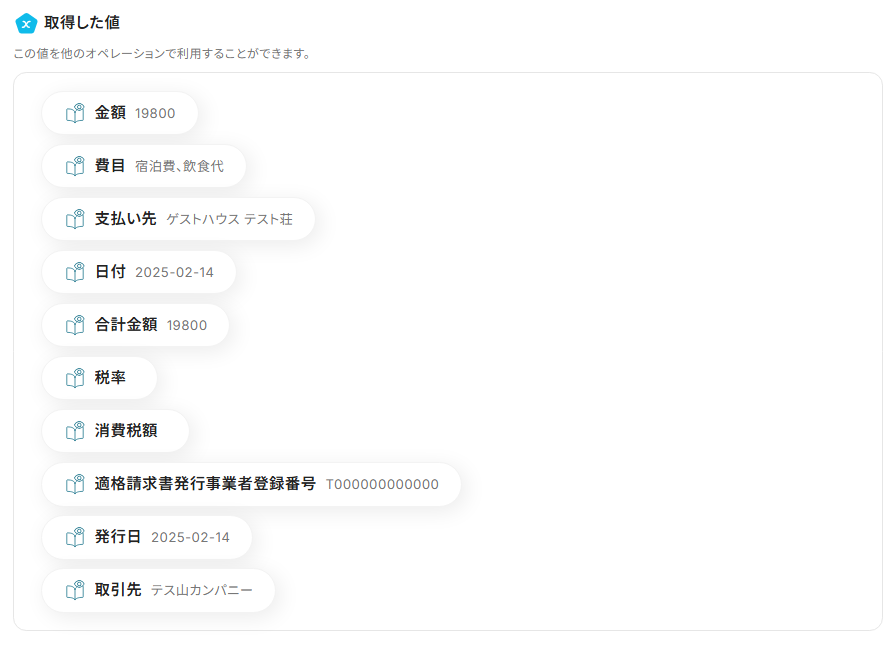 入力が完了したら、「テスト」を実行してみましょう。成功すると、下記のようなアウトプットが表示されます。