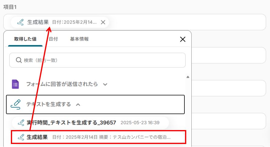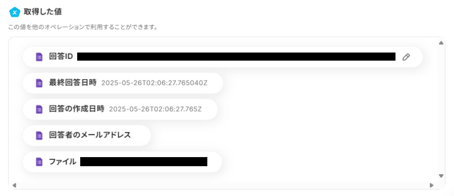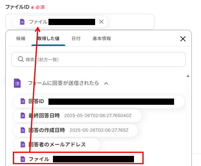 ファイルIDの入力欄をクリックし「取得した値」タブを選択すると、下記のようなアウトプットが表示されます。GoogleフォームのファイルIDを選択しましょう。