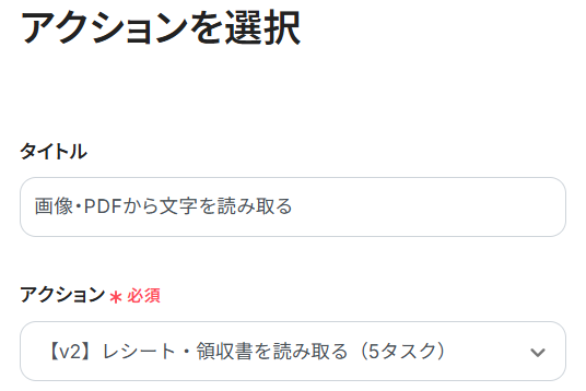 「アクション」は、デフォルトで「【v2】レシート・領収書を読み取る(5タスク)」が選択されています。変更せず、そのままで大丈夫です。
