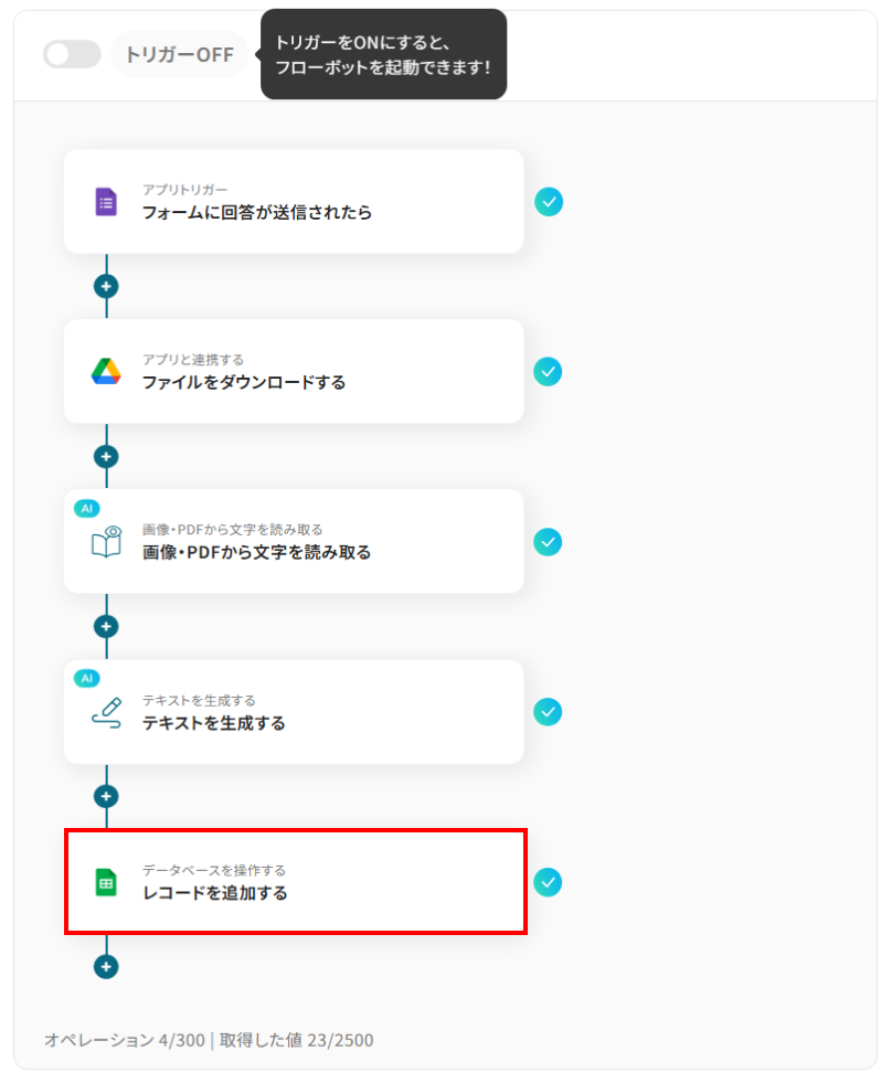 1.先ほど生成したテキストをGoogle スプレッドシートのレコードに追加するための設定をしましょう。
