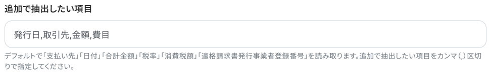 - 追加で抽出したい項目:対象のファイルから抽出したい項目を入力しましょう。複数ある場合はカンマ区切りで指定してください。今回は、全文を抽出したいので下記のように設定しました。