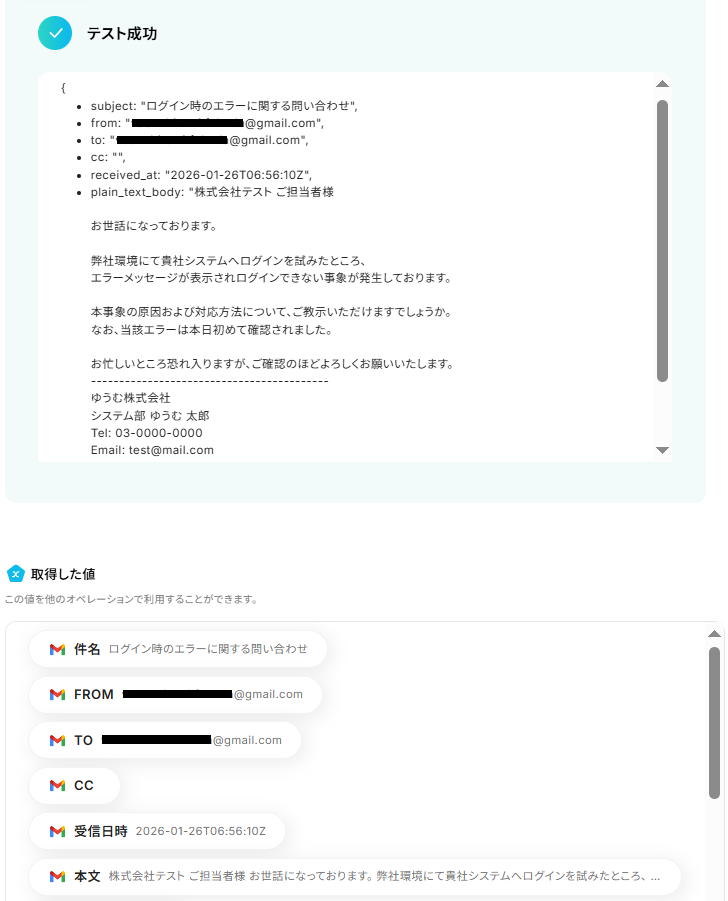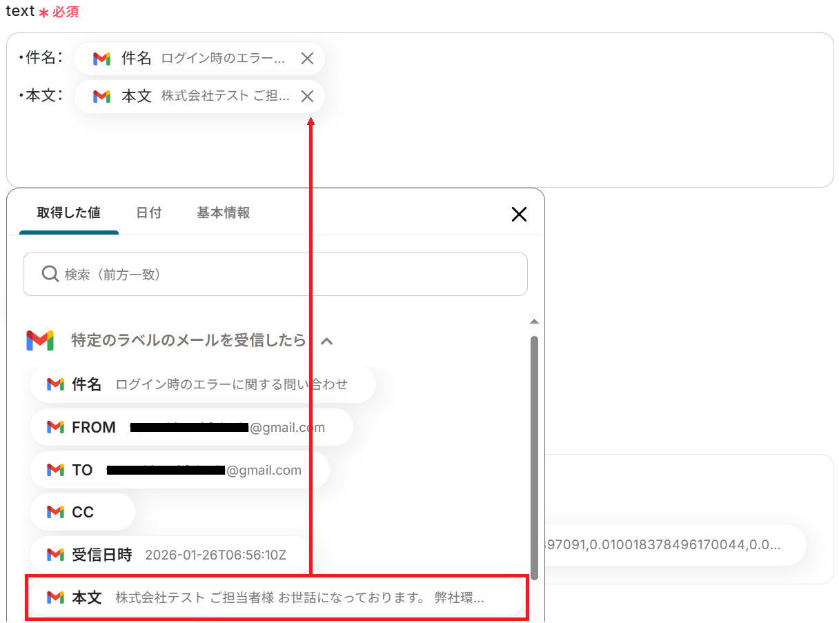 ※以下のように取得した値を設定することで、トリガーが実行されるたびに最新のメール情報が反映されます。