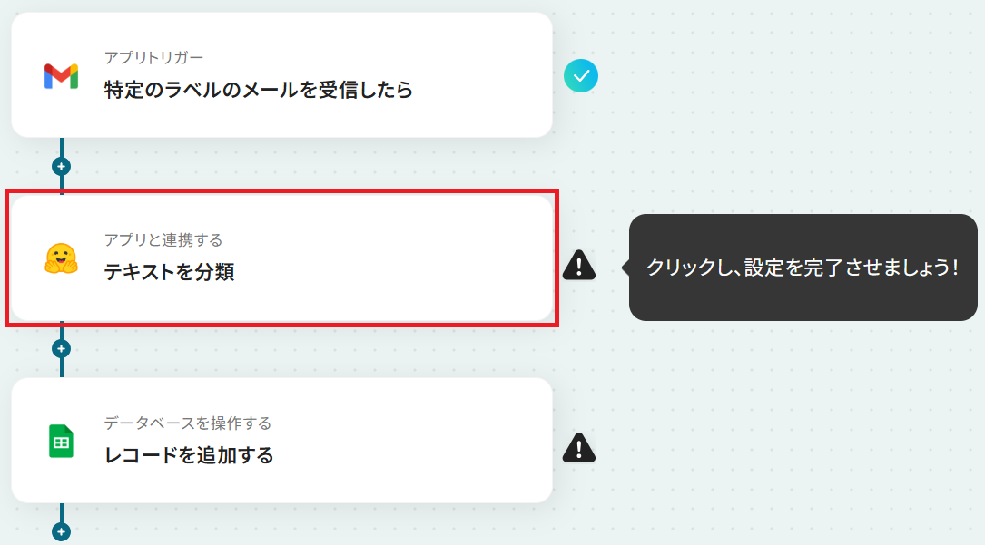 - 次に、オペレーションでHugging Faceの「テキストを分類」アクションを設定し、受信したメールの内容を分類する。
