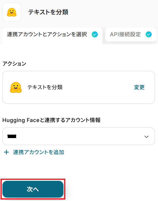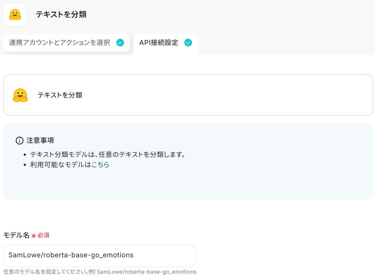 - Hugging Faceでテキストを分類するアクションでは、利用するAIモデルを任意で設定できます。