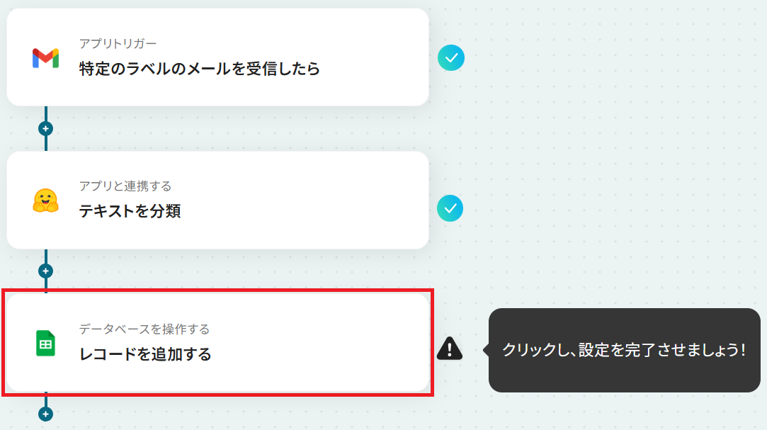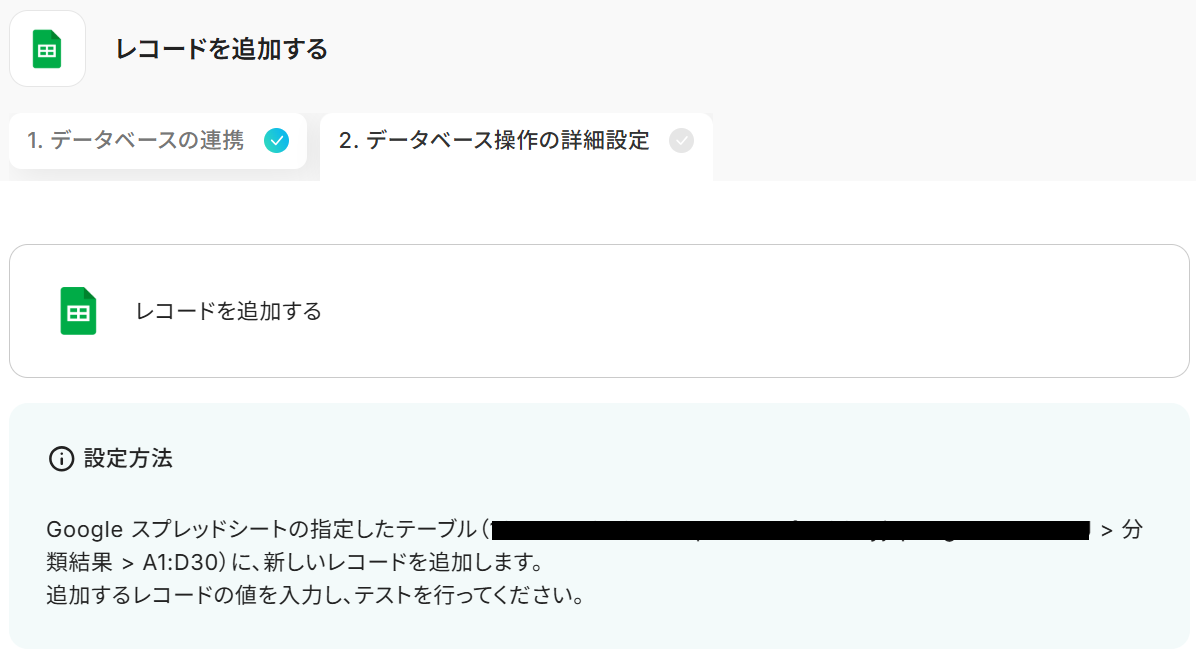 - 最後に、オペレーションでGoogle スプレッドシートの「レコードを追加する」アクションを設定し、分類結果を指定のシートに追加する。