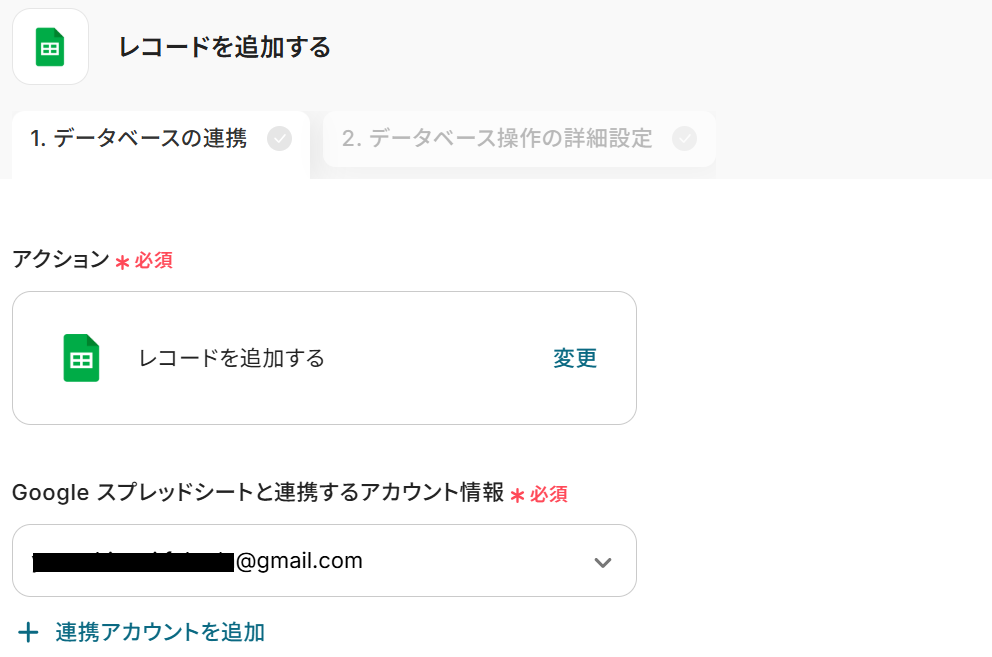 - Google スプレッドシートでレコードを追加するアクションでは、記録先となるデータベース(スプレッドシート、シート)を任意で設定してください。