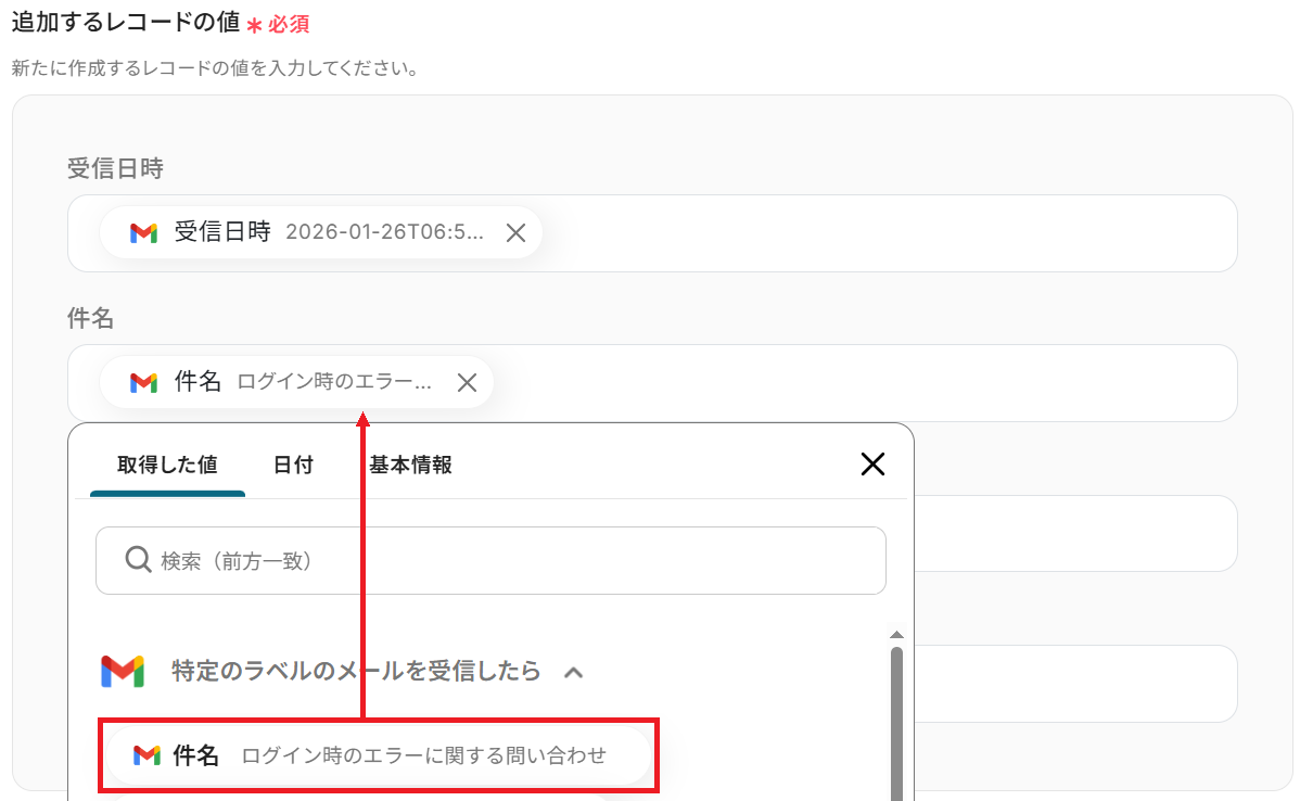 - JUST.DBにレコードを挿入する際、どの項目にどの情報を登録するかを任意に設定できます。例えば、メールの件名や本文などを対応する項目に紐付けたり、対応状況の項目に「新規」といった固定値を入れたりすることが可能です。