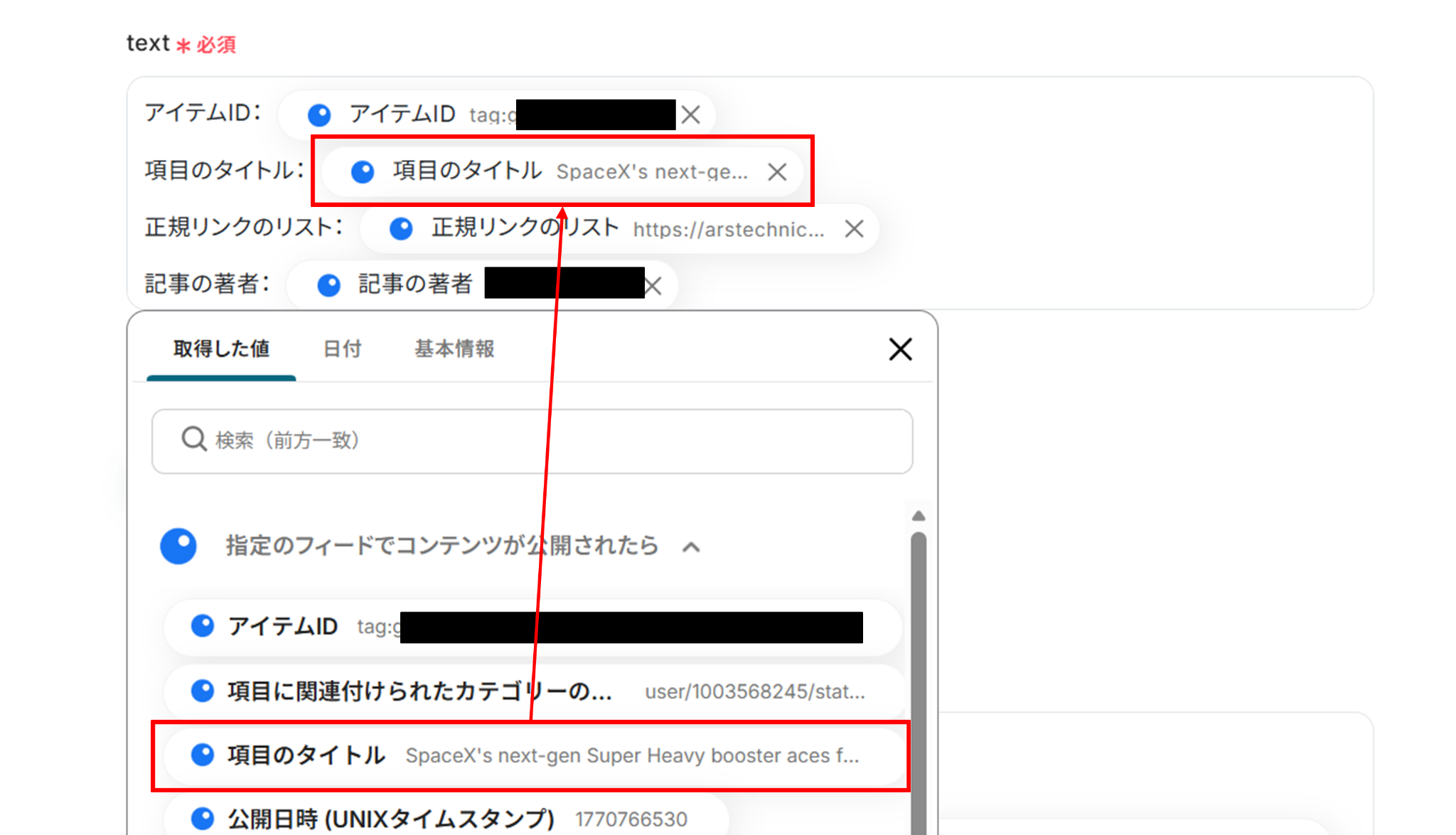 下へ進み、「text」にInoreaderから取得した値を入力します。