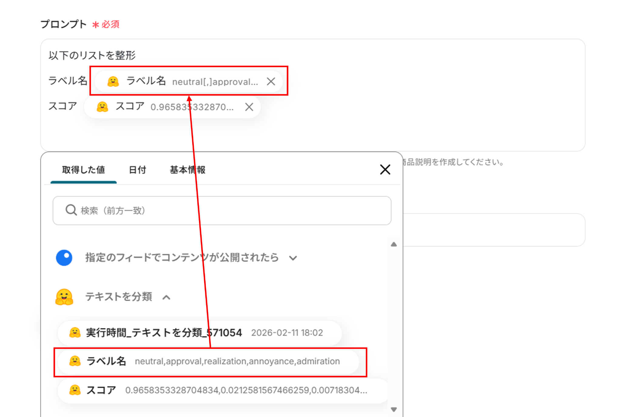 - AIのテキスト生成オペレーションでは、Hugging Faceの分類結果を整形したり、上位のスコアのラベル名だけを抽出したりすることが可能です。