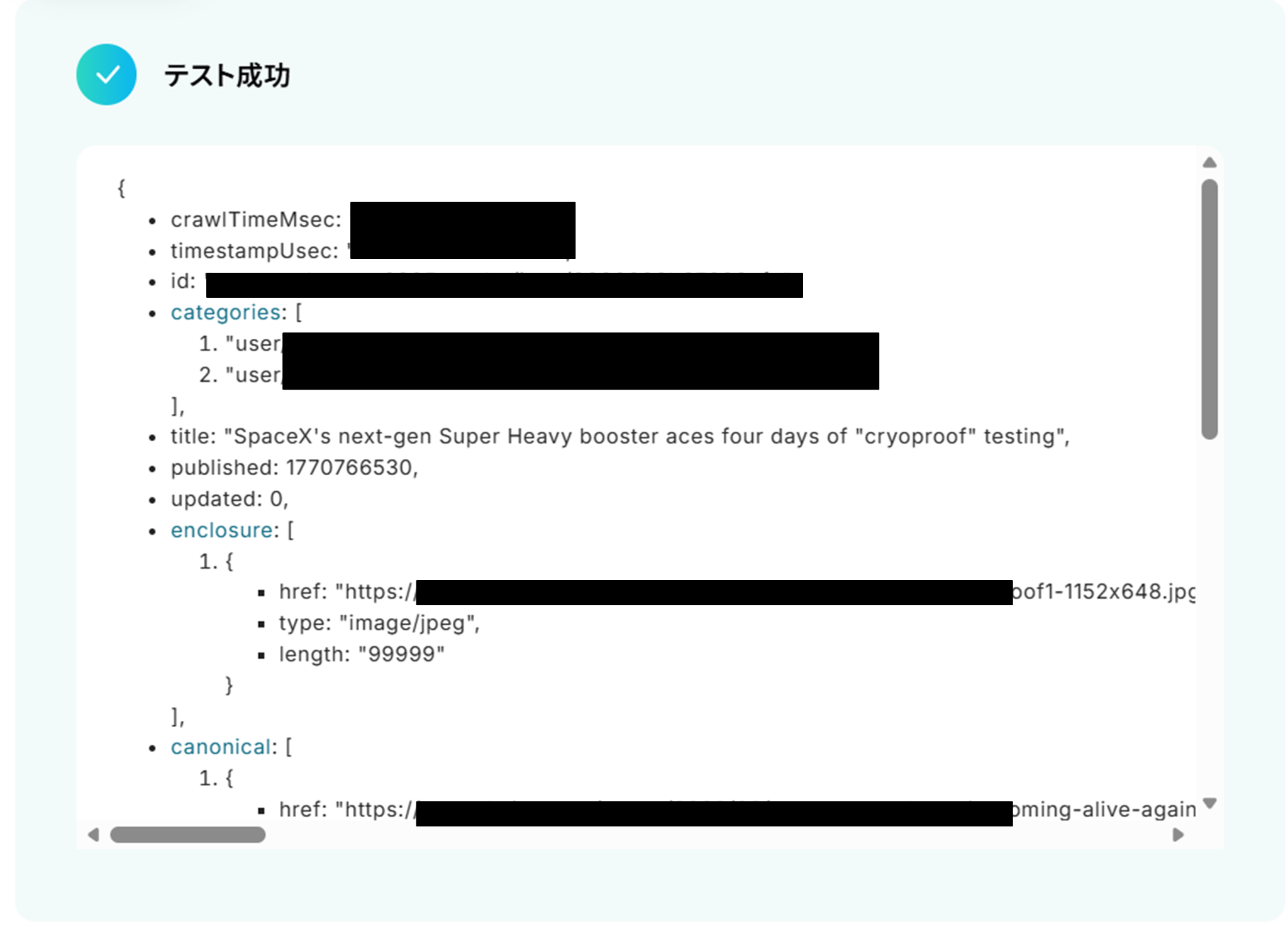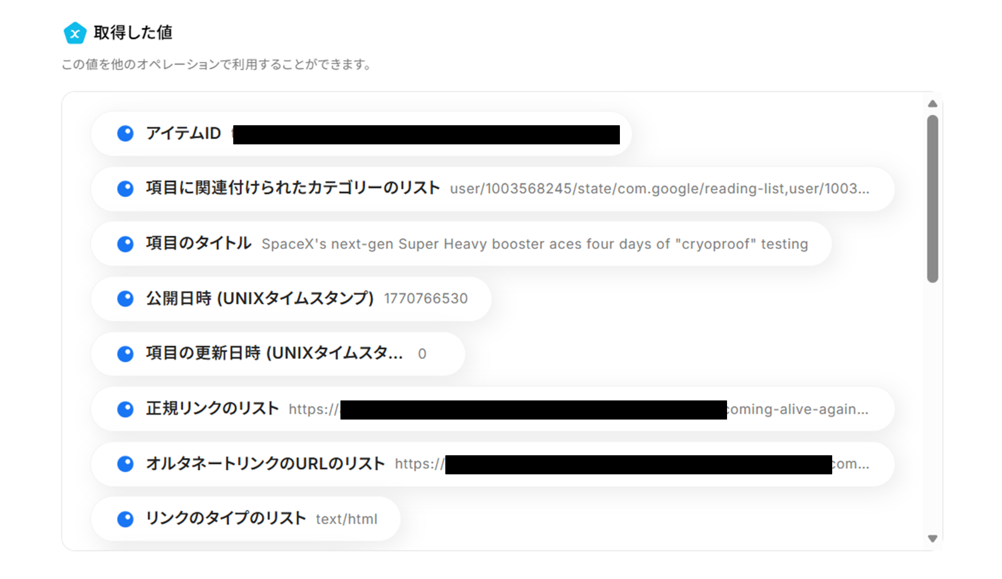 テストに成功すると、取得した値にInoreaderの情報が反映されます。