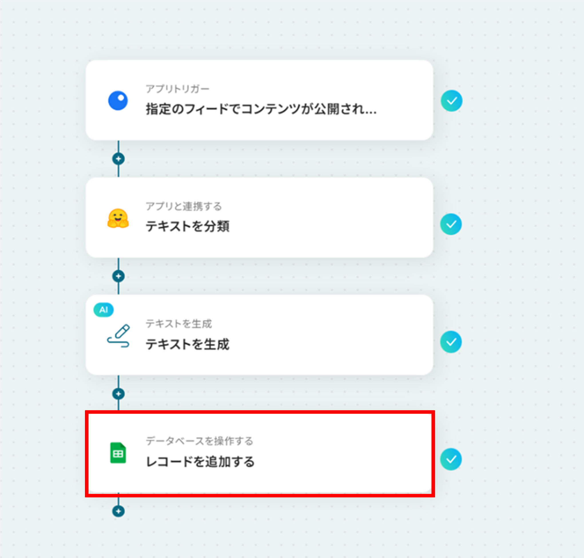 - 最後に、オペレーションでGoogle スプレッドシートの「レコードを追加する」アクションを設定し、分類結果などの情報を指定のシートに行として追加します。