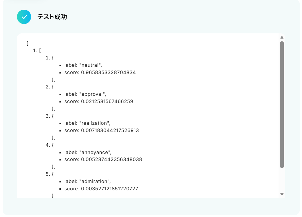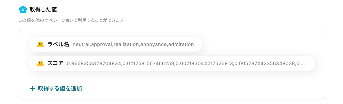 テストに成功すると「取得した値」にHugging Faceの情報が追加されます。