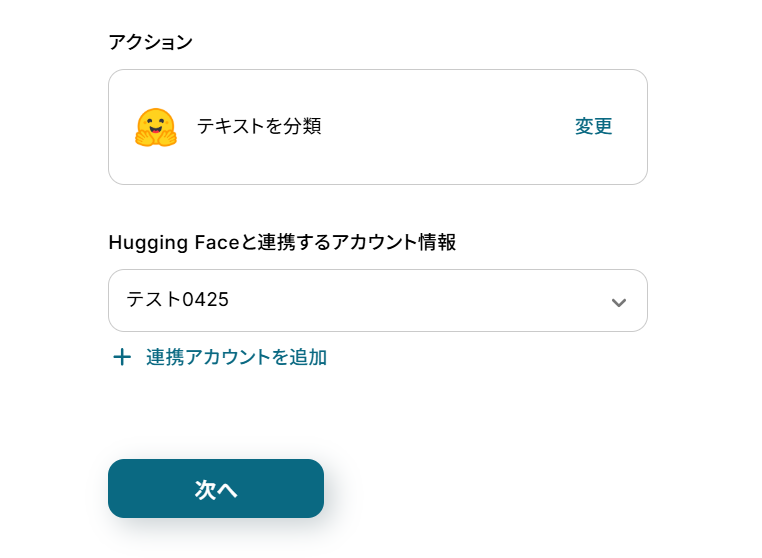(2)「連携アカウントとアクションを選択」画面から、Hugging Faceと連携するアカウント情報に誤りがないかを確認し、アクションは「テキストを分類」のままで「次へ」をクリックしましょう。