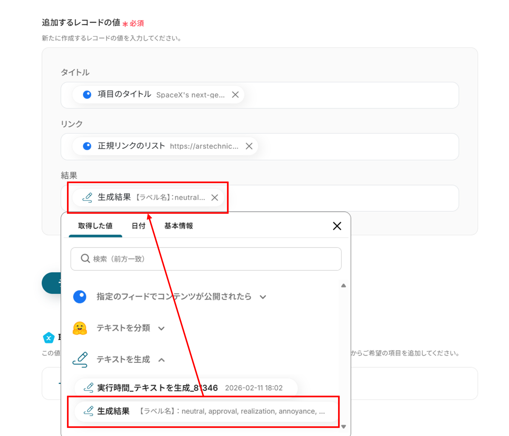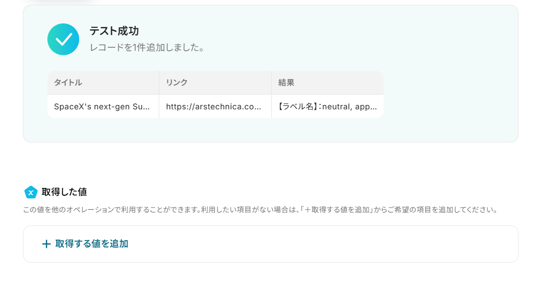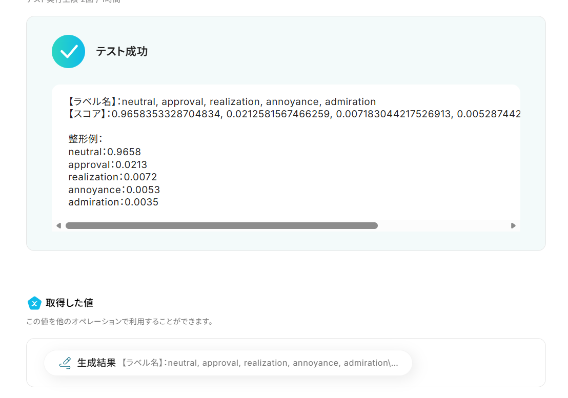 テストに成功すると、取得した値に「生成結果」が追加されます。