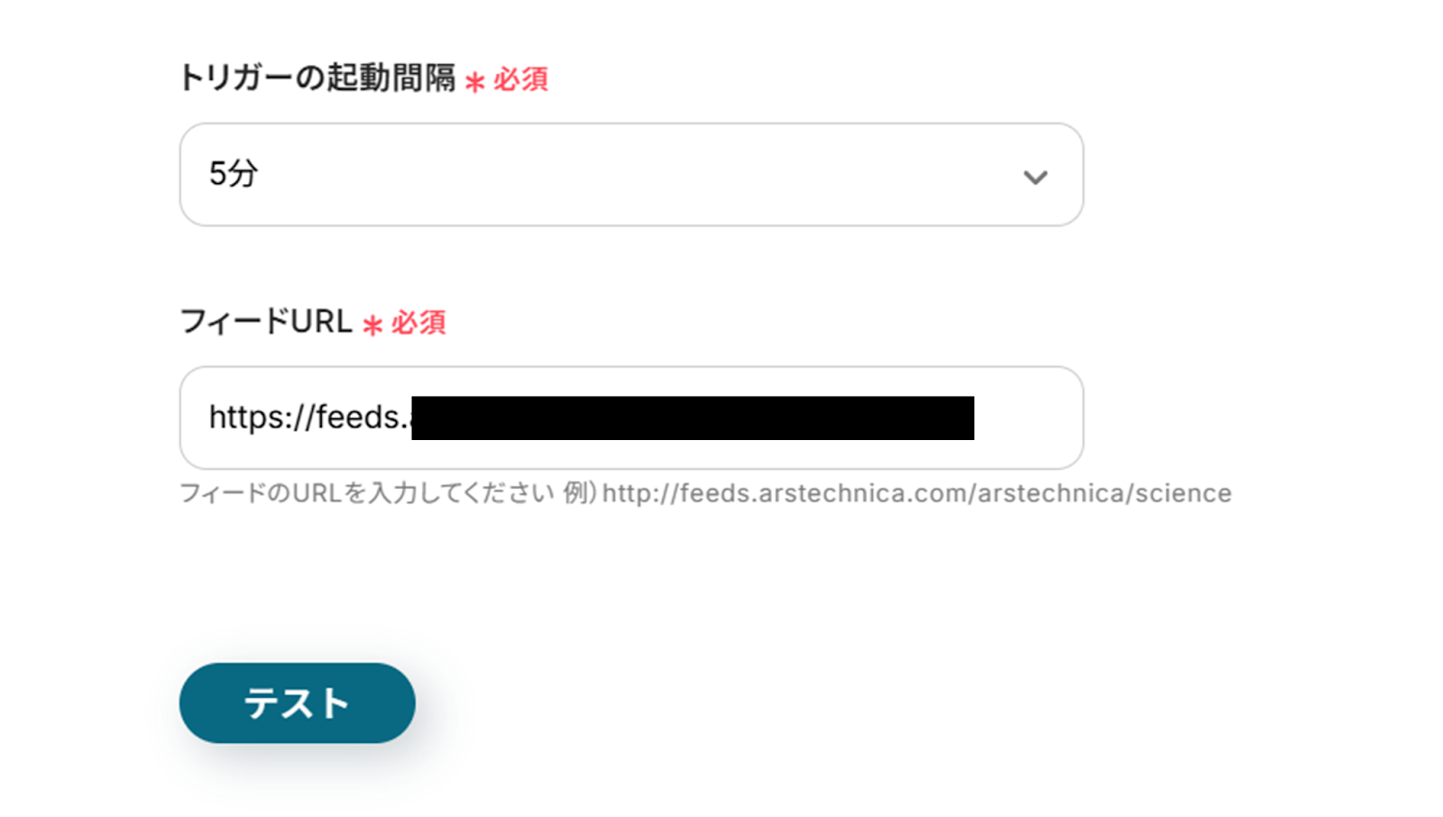 下へ進み、対象のフィードURLを入力し「テスト」をクリックしましょう。