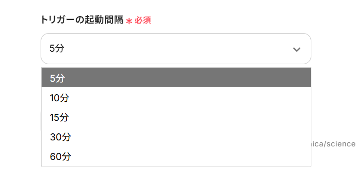 - トリガーは5分、10分、15分、30分、60分の間隔で起動間隔を選択できます。
