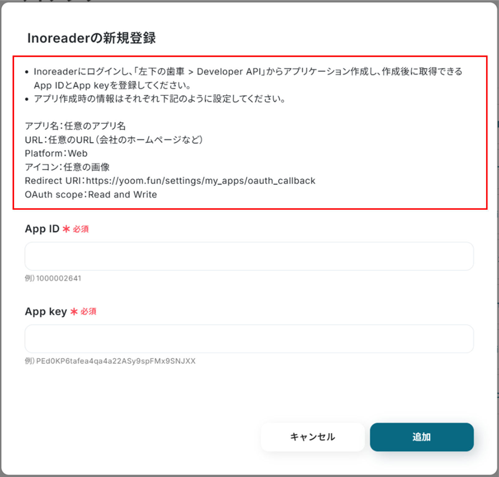 (2)「Inoreaderの新規登録」画面から、赤枠を確認の上、App ID、App keyを入力し「追加」
