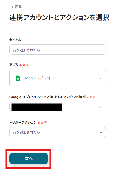 タイトルとアクションはあらかじめ設定されている「行が追加されたら」のままでOKです。 Google スプレッドシートと連携するアカウントを確認し「次へ」をクリックしてください。