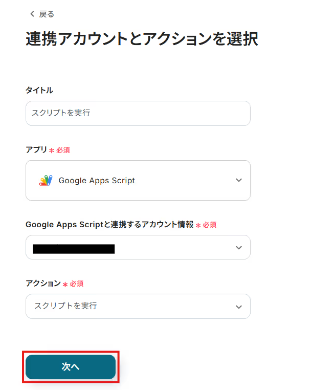 タイトルとアクションは「スクリプトを実行」のままでOKです。 Google Apps Scriptと連携するアカウント情報を確認して「次へ」をクリックします。