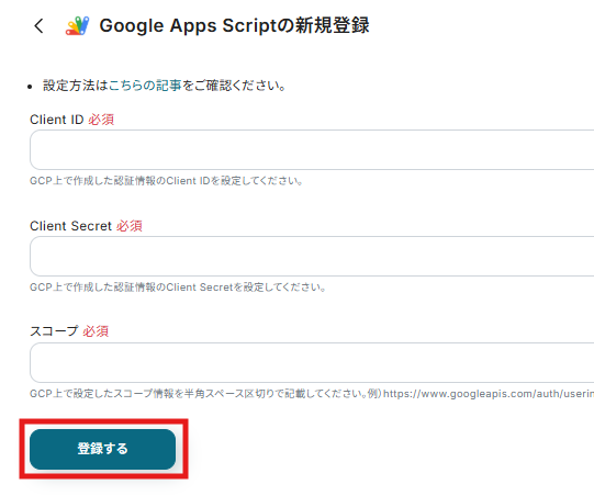 Client ID、Client Secret、スコープを入力し、「登録する」をクリックするとGoogle Apps Scriptのマイアプリ連携が完了します。 Google Apps Scriptの詳しい連携方法はこちら を確認してください。