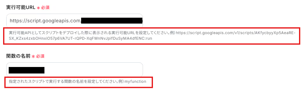「実行可能URL」と「関数の名前」をそれぞれ入力欄の下の説明に従って入力してください。詳しくはこちら をご参照ください。