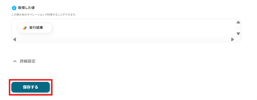 テストに成功すると「取得した値」に設定したシート内の情報が表示されます。問題なければ、「保存する」をクリックして設定完了です。 ※詳しくはこちら をご参照ください。