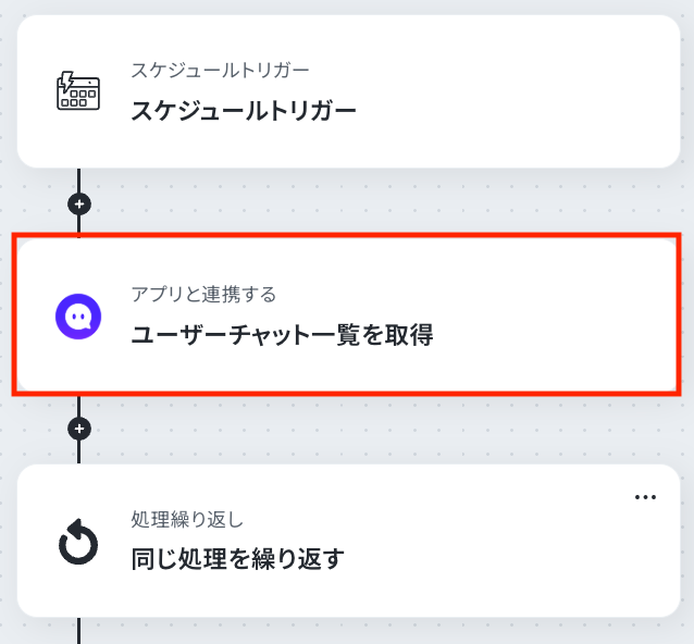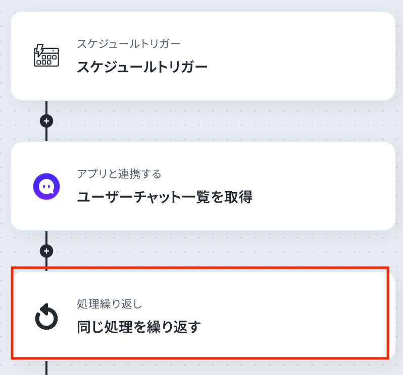 続いて、前のステップで取得したユーザーチャットを1件ずつ処理するため、「同じ処理を繰り返す」を設定しましょう。