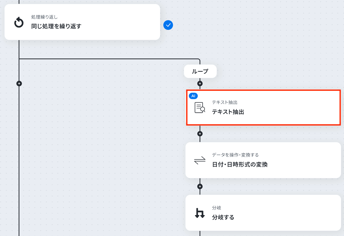 続いて、前のステップで取得した値を利用して、後続ステップで必要なテキストを抽出する設定を行いましょう。