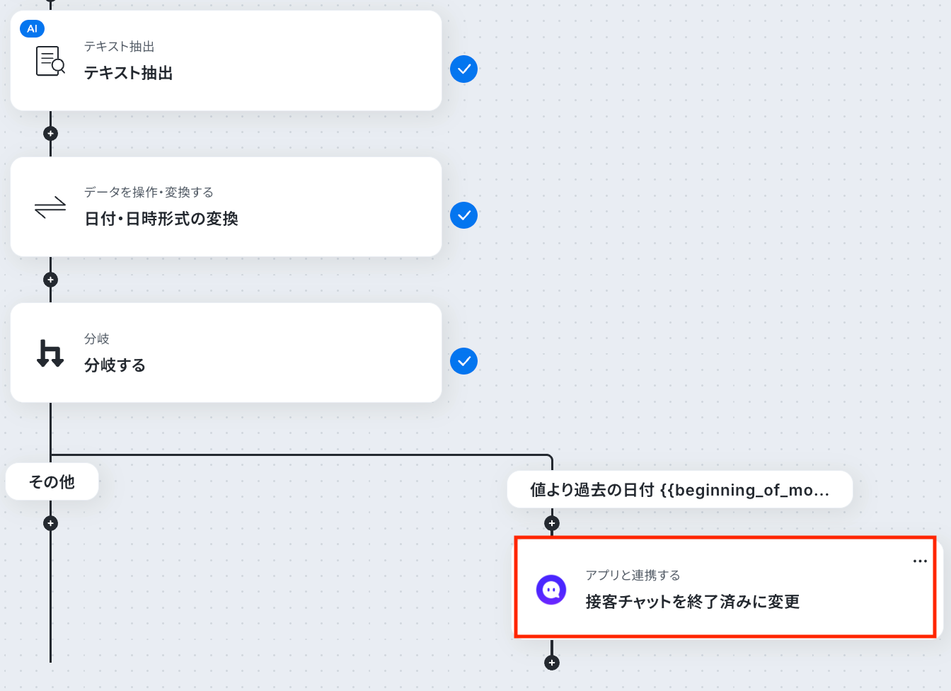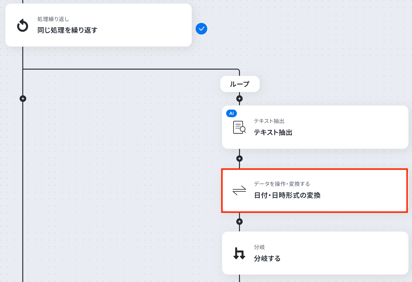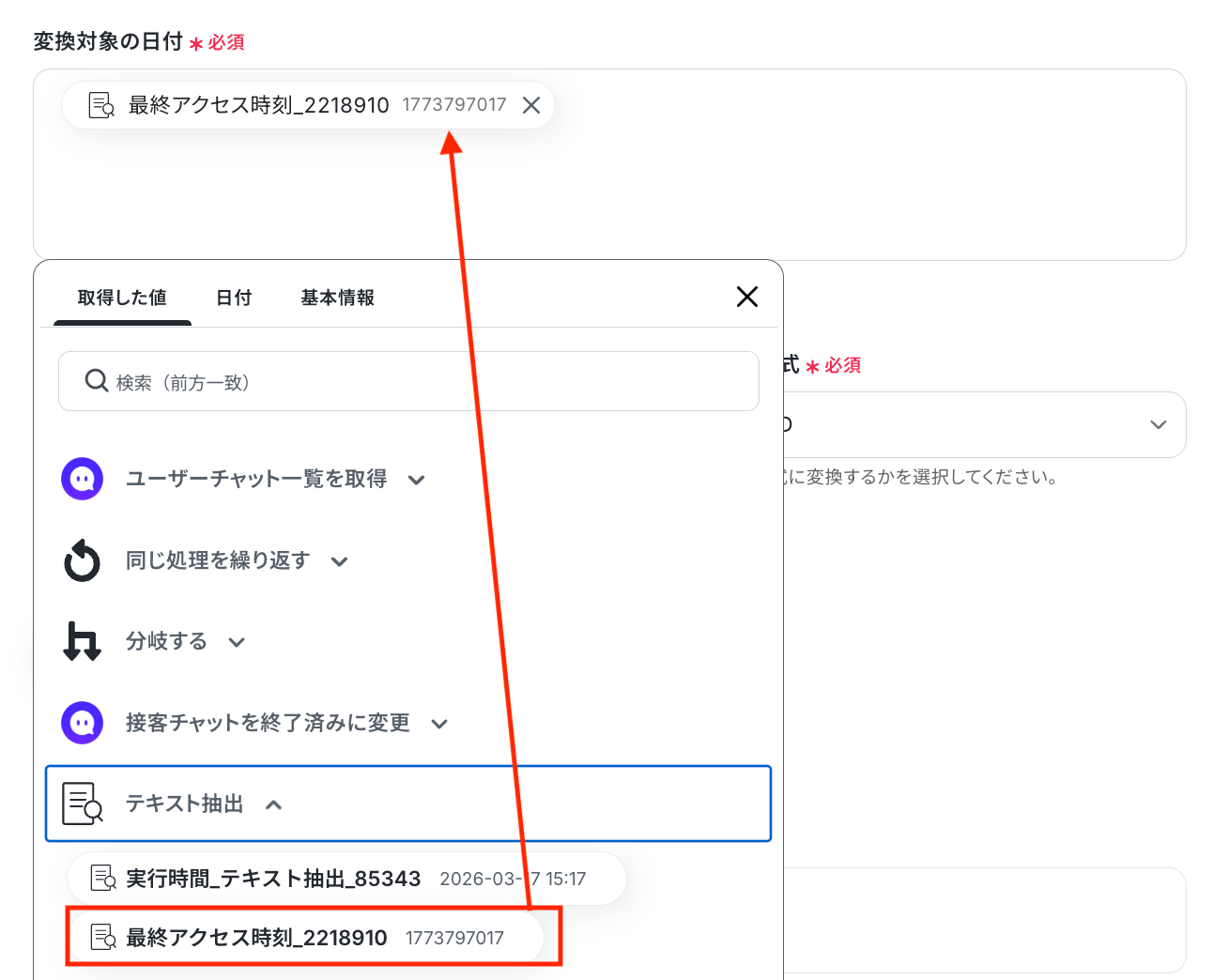 続いて、特定の日付をもとにチャネルトークの接客チャットを終了済みに変更するため、日付・日時形式の変換設定を行いましょう。
