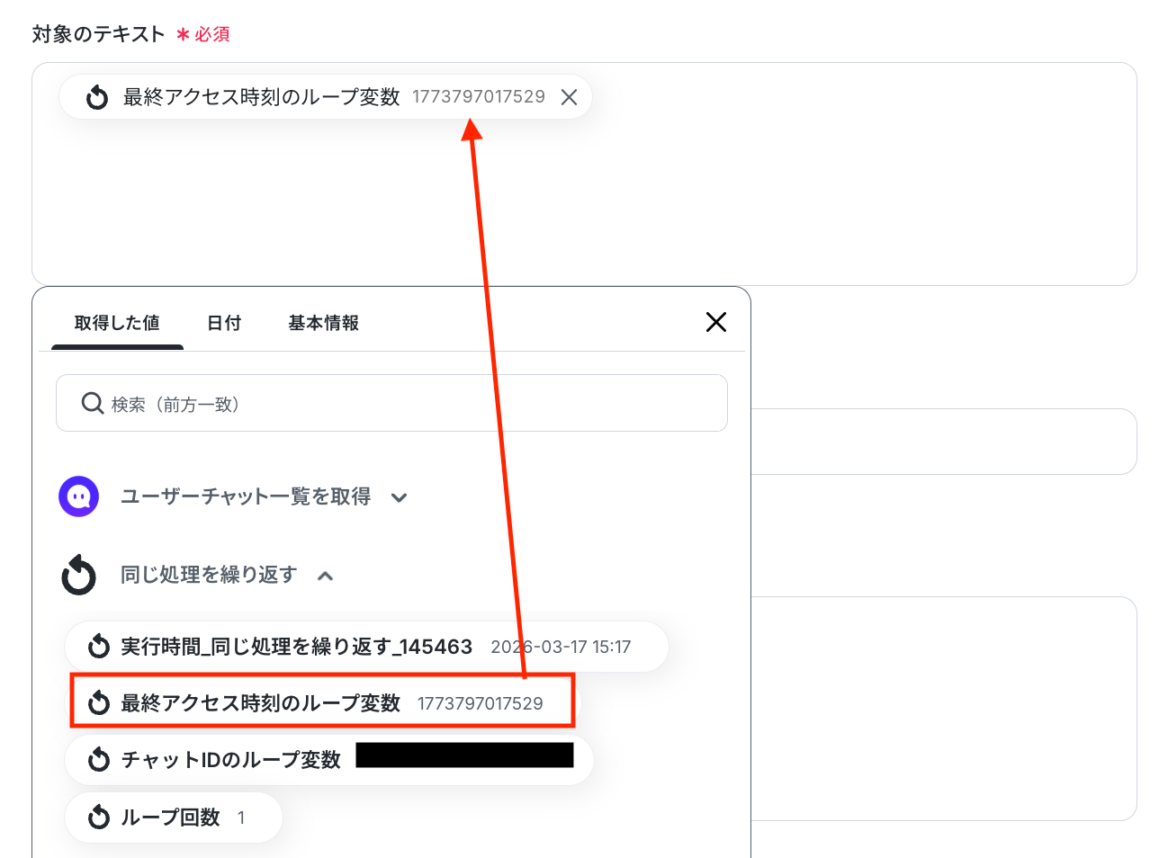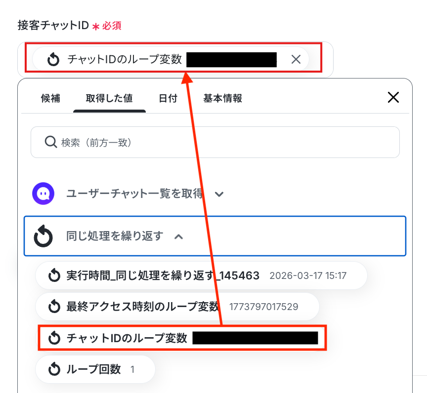 入力欄をクリックすると、前のステップで取得した値が表示されるので、選択して入力しましょう。