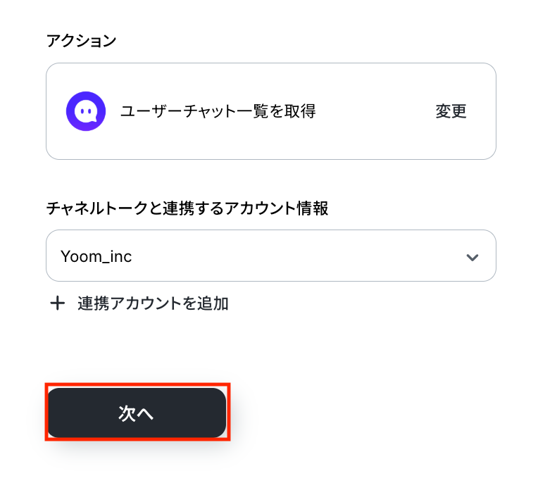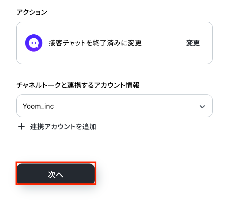 チャネルトークと連携するアカウント情報に問題がなければ、「次へ」をクリックします。