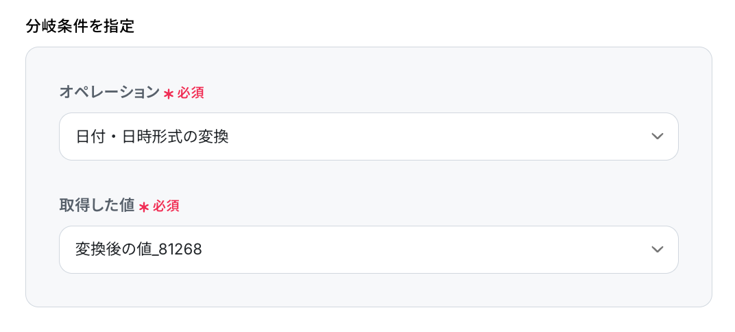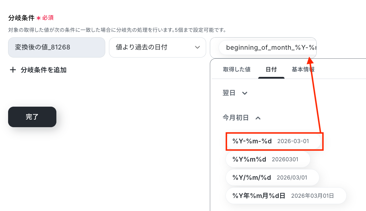 この設定により、変換後の日付が今月の開始日よりも過去の場合にのみ分岐処理が実行されます。