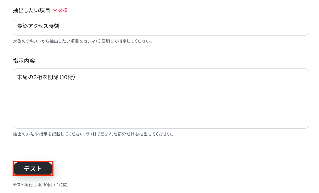 入力が完了したら、設定した項目が実際に正しく抽出されるかどうかを確認するため「テスト」をクリックしましょう。