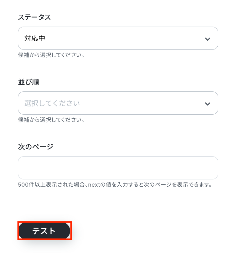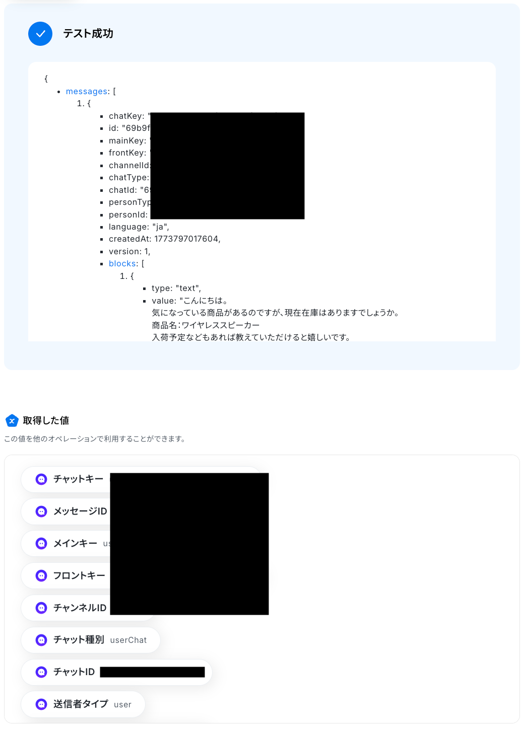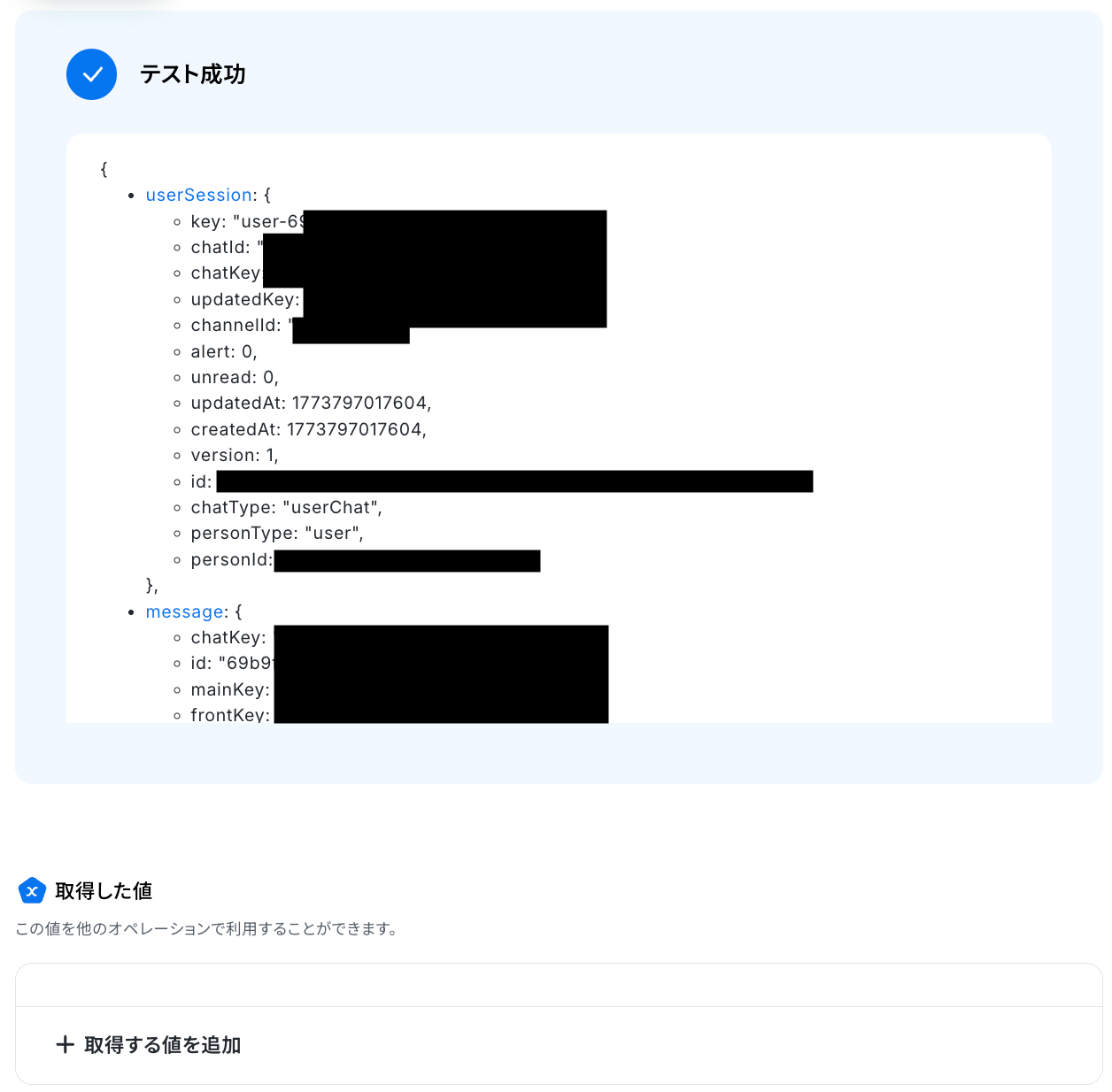 入力が完了したら「テスト」をクリックして、設定した内容でユーザーチャットの一覧が取得されるか確認しましょう。