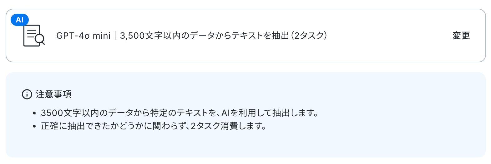 変換タイプは「GPT-4o mini|3,500文字以内のデータからテキストを抽出(2タスク)」 がデフォルトで設定されているため、そのまま内容を確認してください。