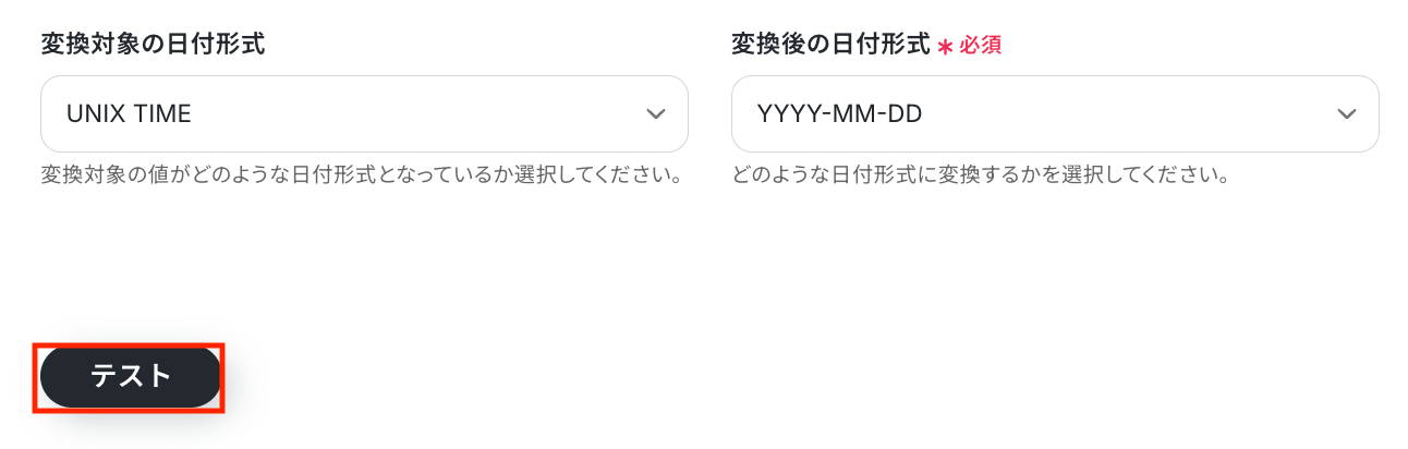 入力が完了したら「テスト」をクリックして、設定した内容で正しく日付形式が変換されるか確認しましょう。