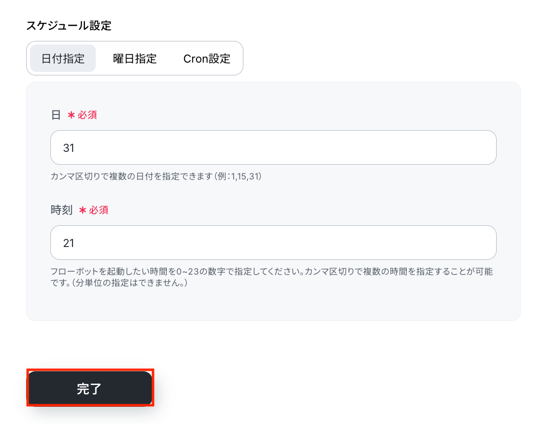 今回は、毎月月末の21時にフローボットを実行するよう以下のスケジュールを設定しています。