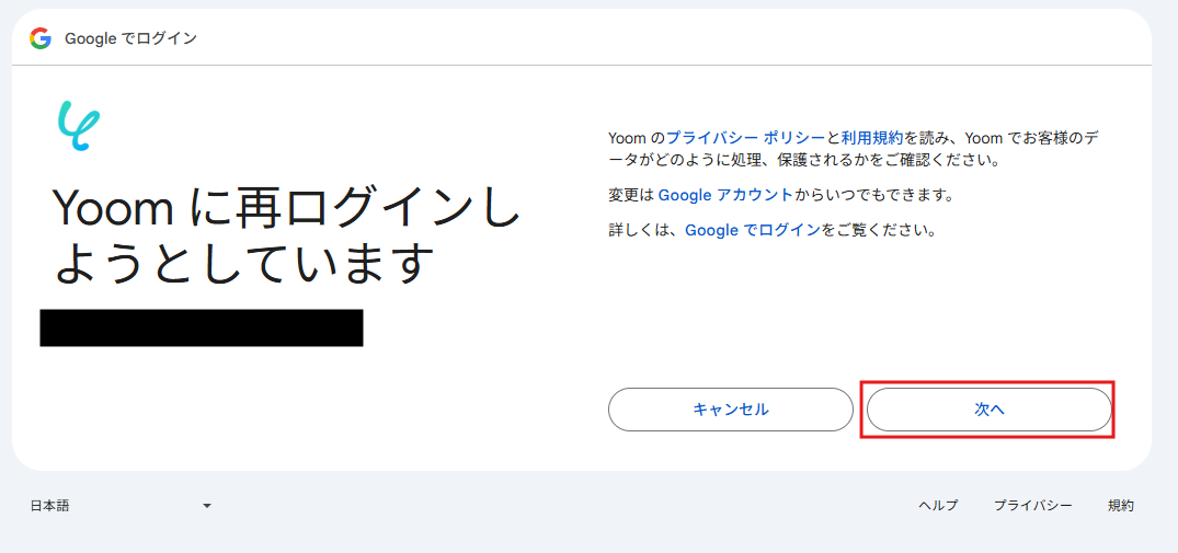 以下の画面を確認したら、Googleアカウントにログインしてください。