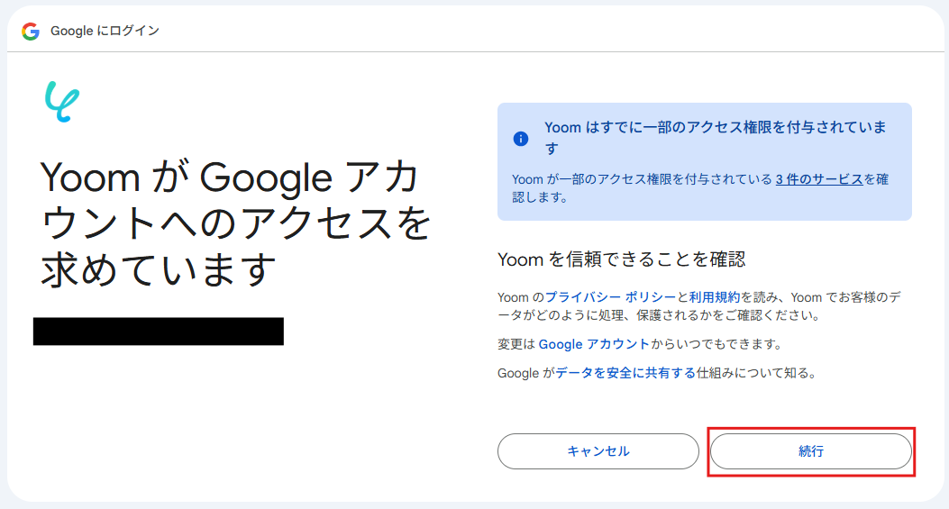 以下の画面が出てきたら、連携するアカウント情報を確認して、次に進みます。
