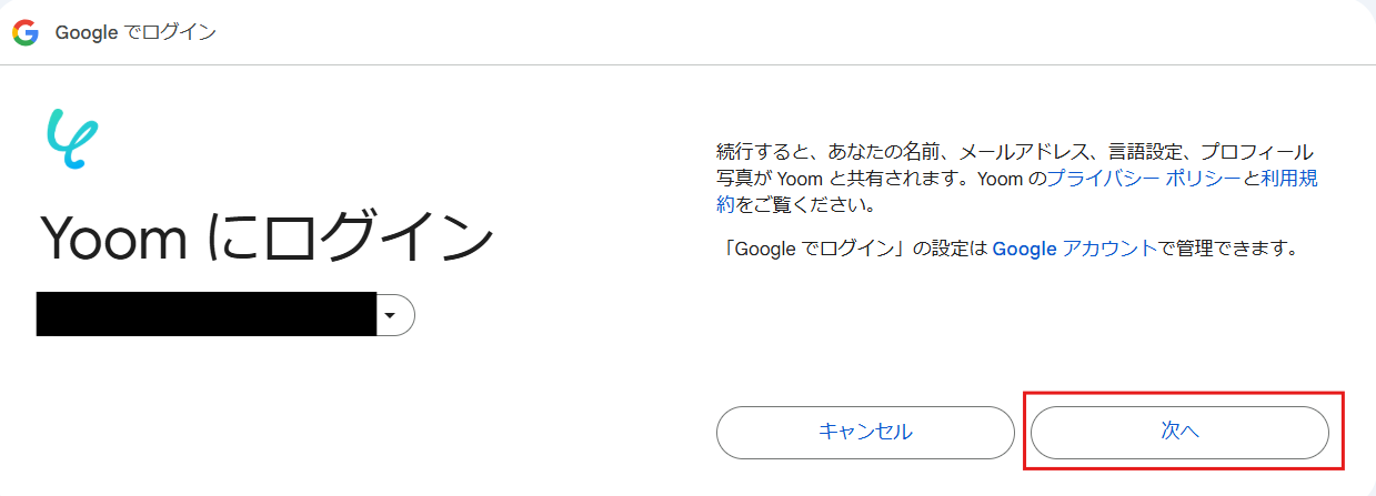以下画面が出てきたら、アカウントを確認して「次へ」をクリックしましょう。