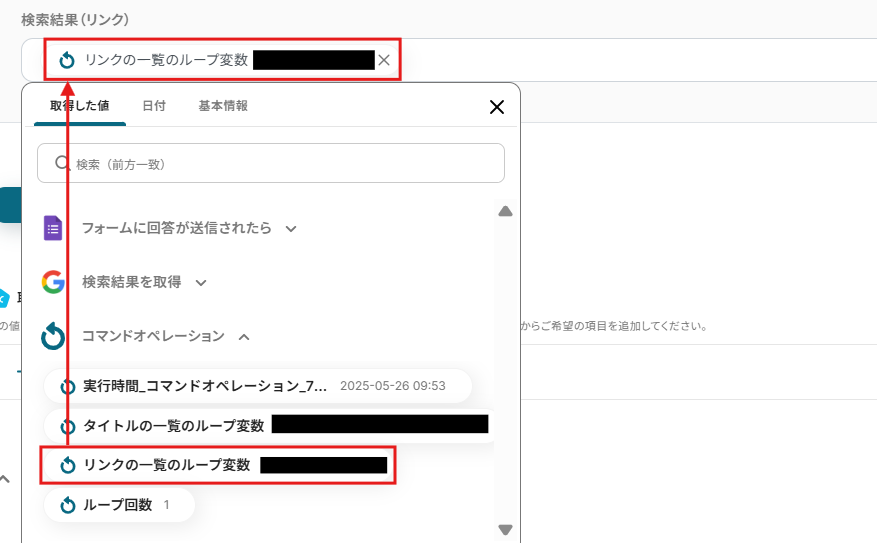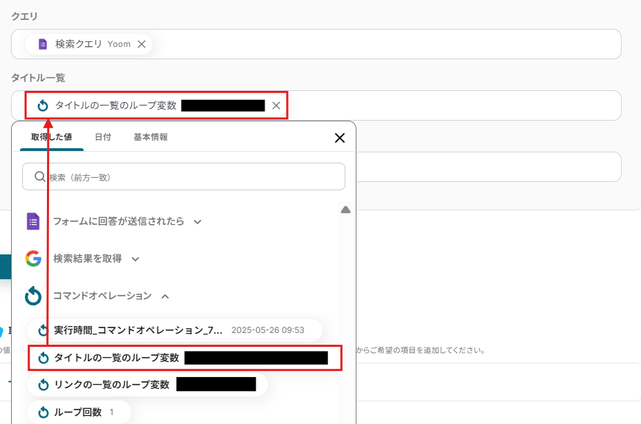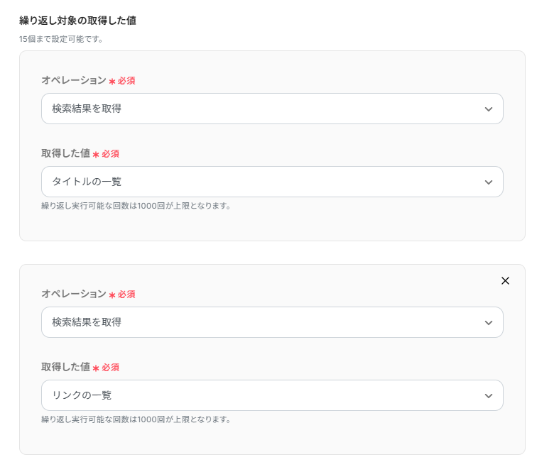 続いて、繰り返し対象を指定を行っていきます。繰り返し対象の取得した値は以下のように設定してください。