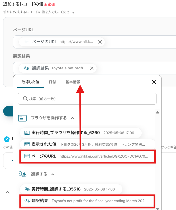 追加するレコードの値」にはGoogle スプレッドシートで設定した項目名が表示されます。