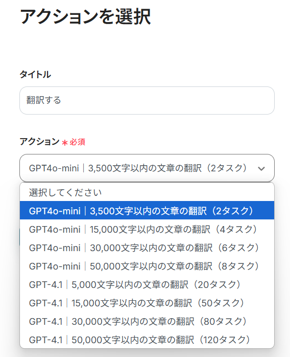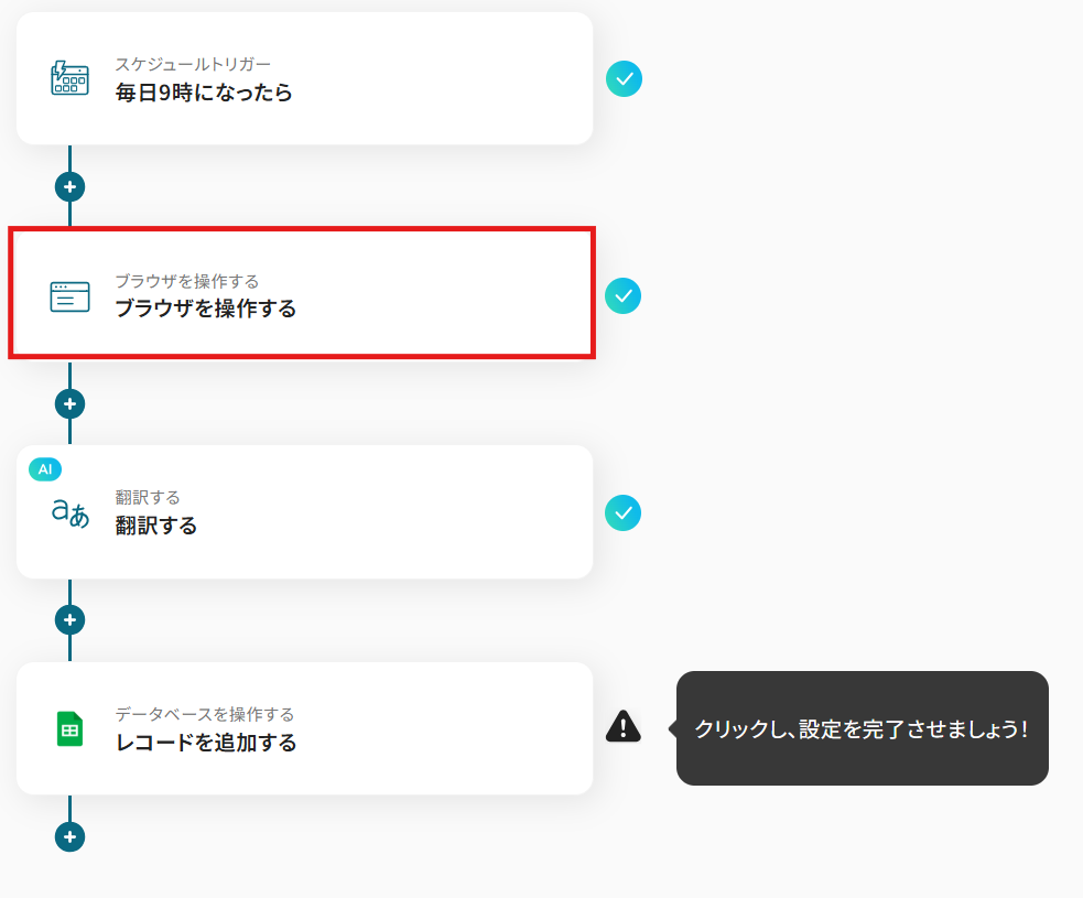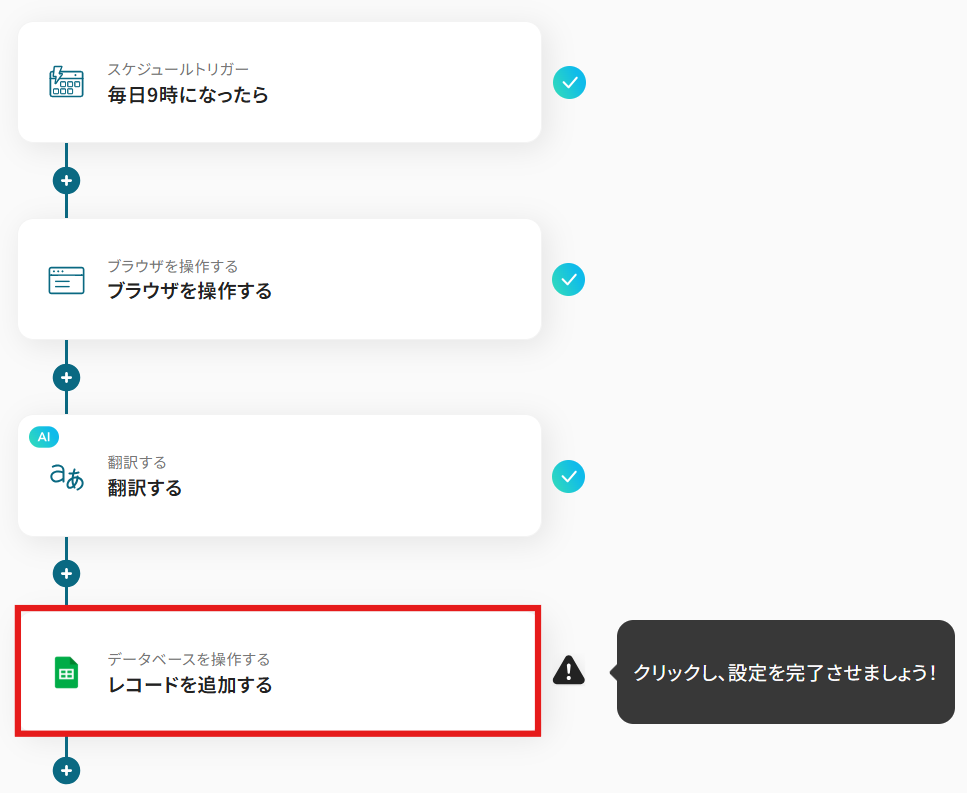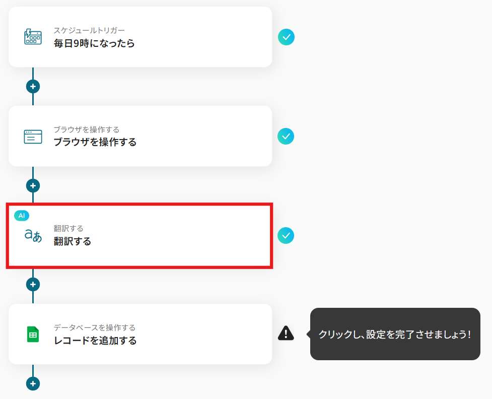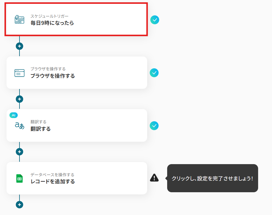 - スケジュールトリガー、RPAによる情報収集オペレーションの作成、AIによる翻訳処理、Google スプレッドシートのアクション設定