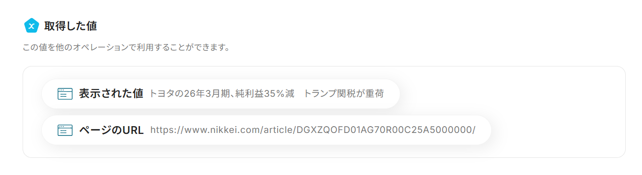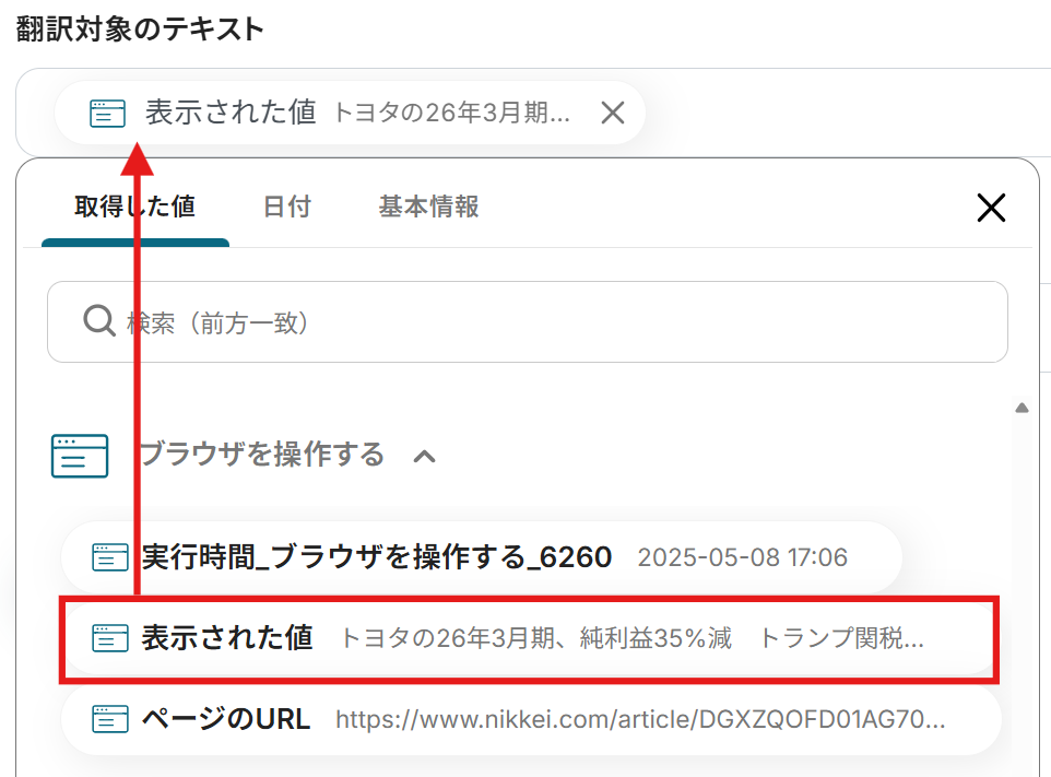 先ほど取得したアウトプットから「表示された値」を活用します。