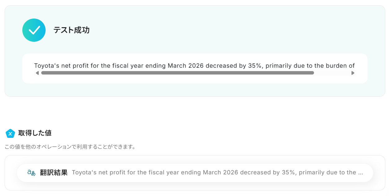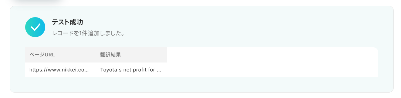 「テスト成功」と表示され、その下に「アウトプット」が表示されます。