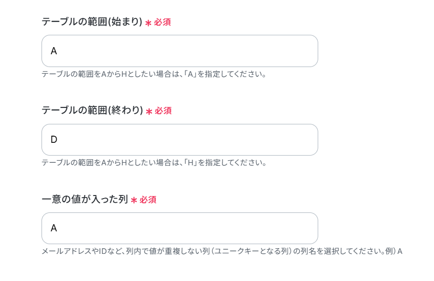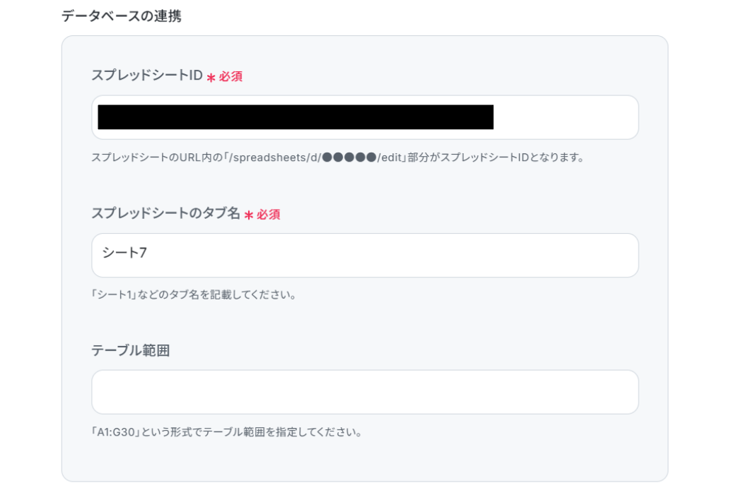 テーブル範囲は必須項目ではありませんが、Google スプレッドシートの範囲を指定したい場合は直接入力します。