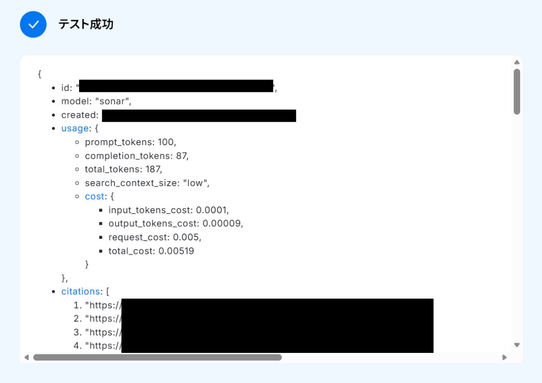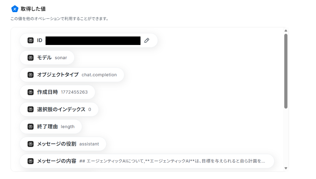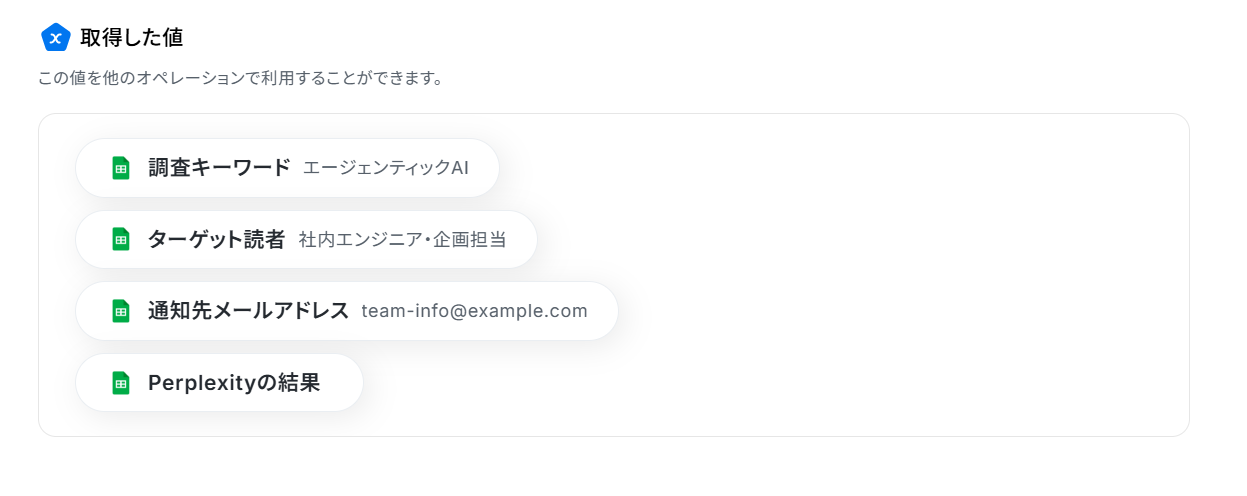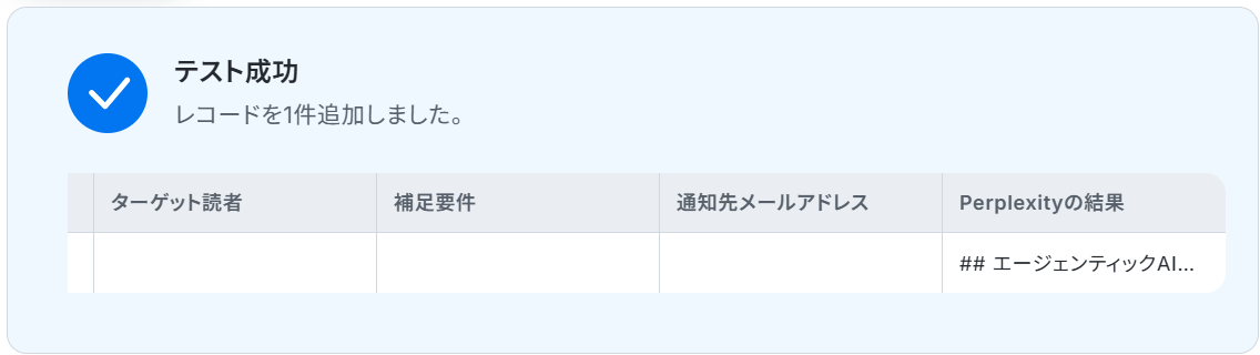 テストに成功すると、「取得した値」にPerplexityで生成されたテキストが追加されます! 「完了」をクリックして最後の工程に進みましょう。