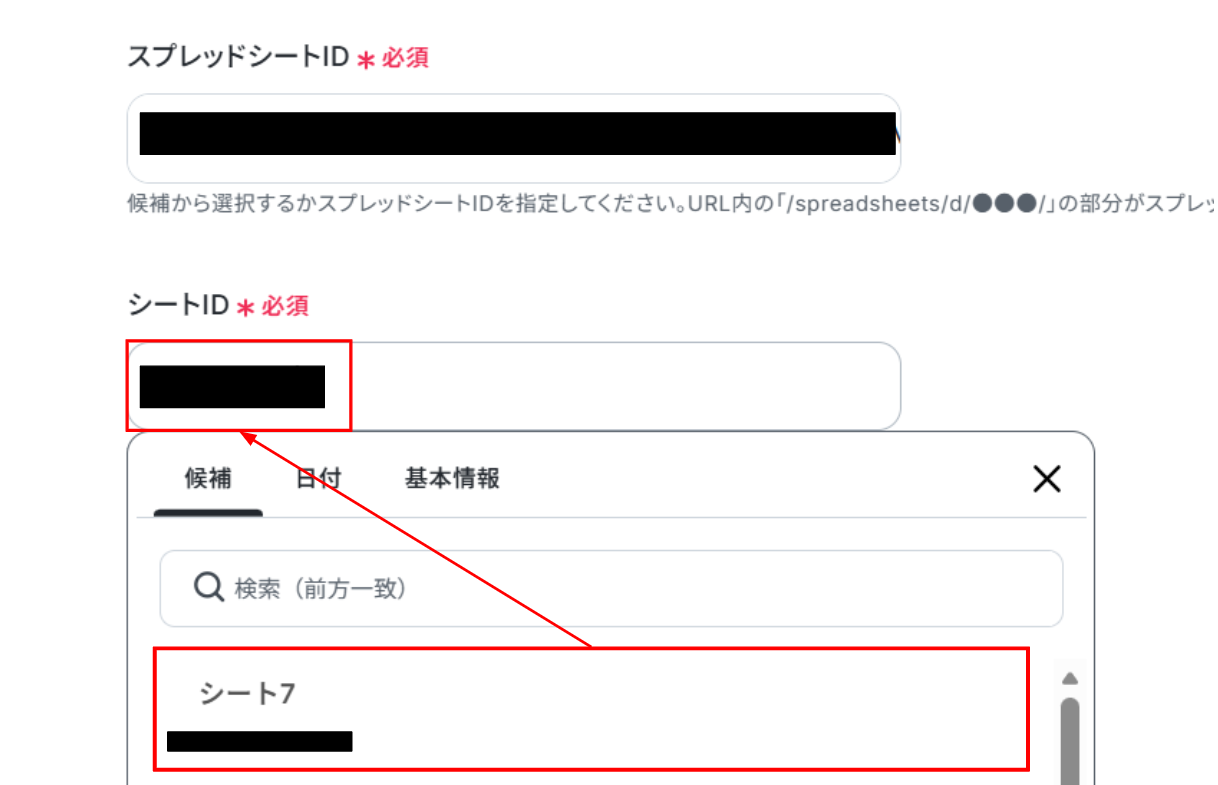 下へ進み、「スプレッドシートID」「シートID」を候補から選択します。