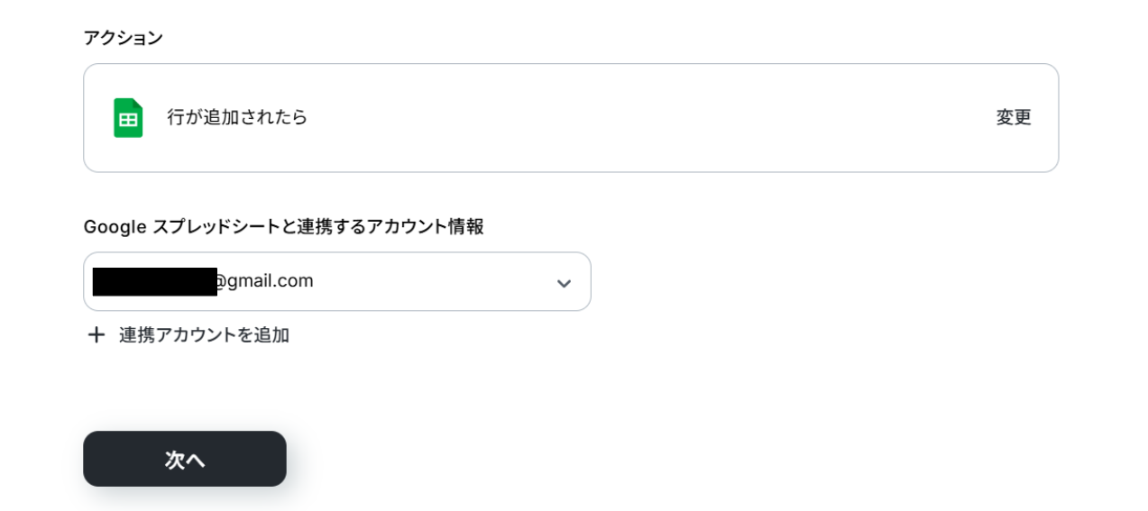(2)Google スプレッドシートと連携するアカウント情報に誤りがないかを確認し、アクションは「行が追加されたら」のままで「次へ」をクリックします。