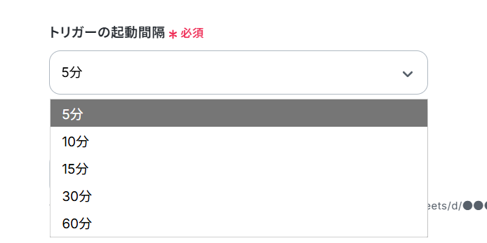 (3)「API接続設定」画面から、トリガーの起動間隔を選択します。 プルダウンより5分、10分、15分、30分、60分の間隔から選択してください。